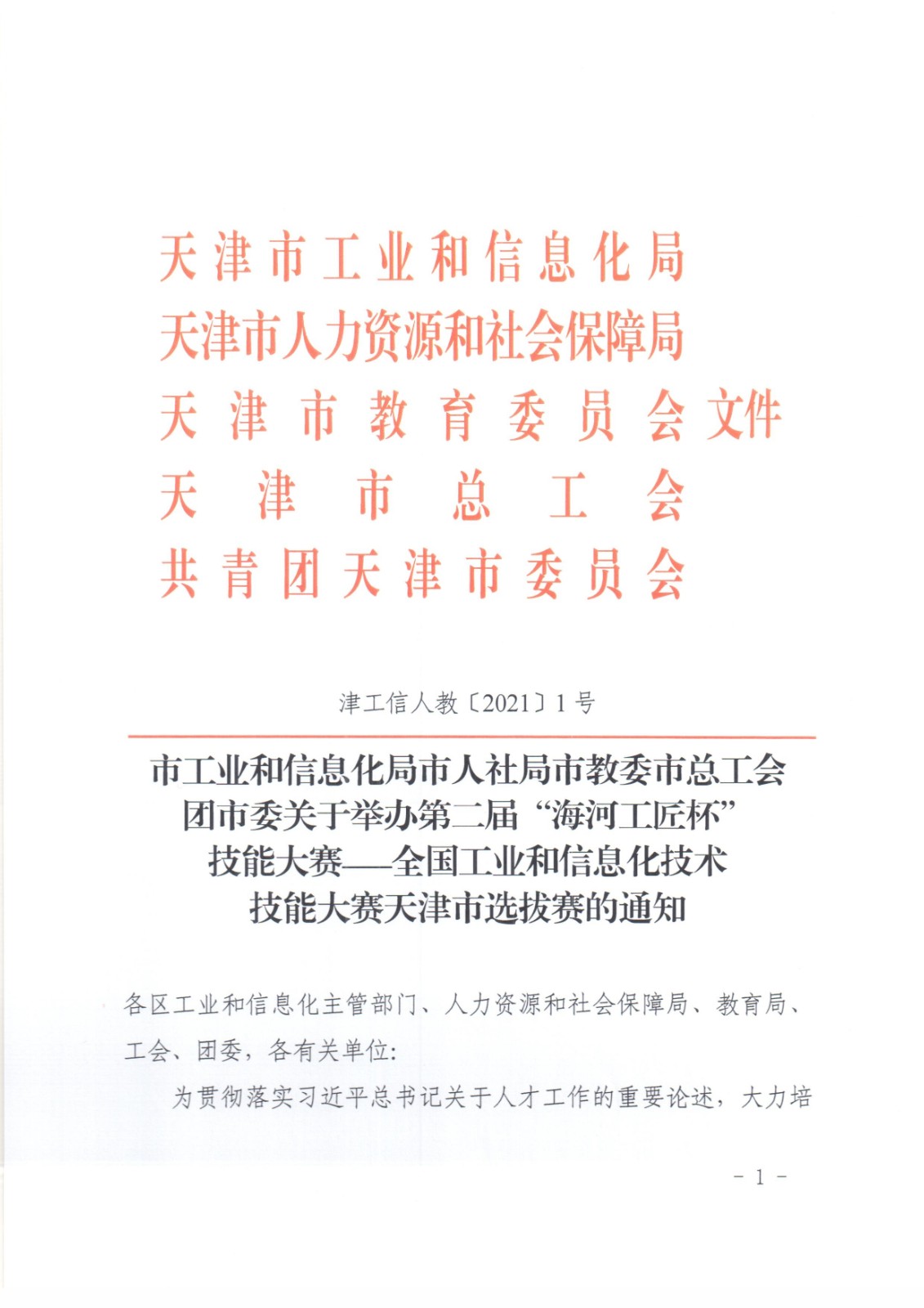 天津市2021年全國工業(yè)和信息化技術(shù)技能大賽選拔賽通知