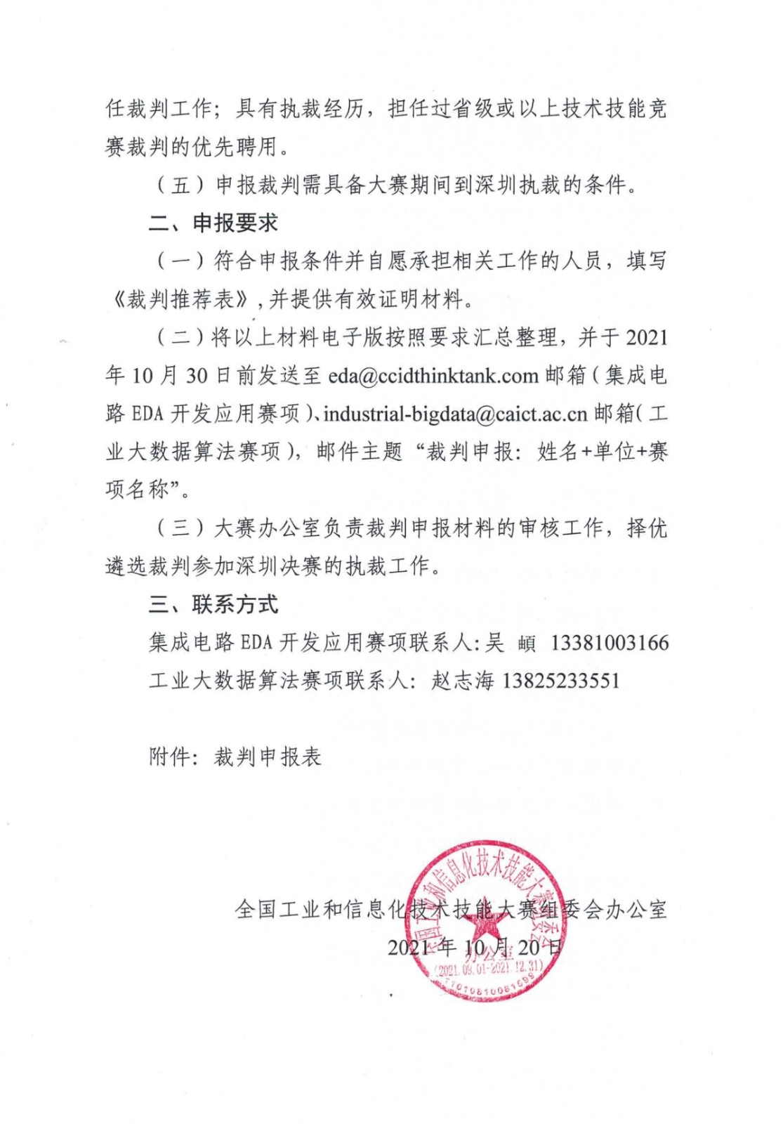 關(guān)于遴選2021年全國(guó)工業(yè)和信息化技術(shù)技能大賽裁判的通知