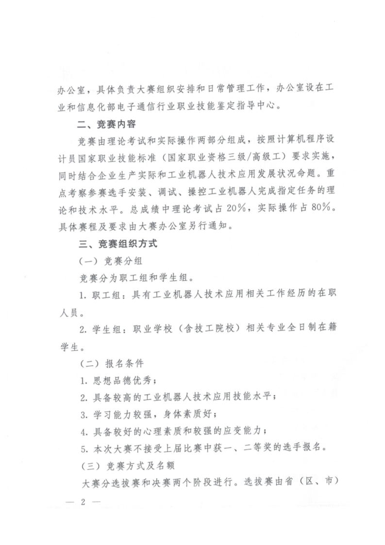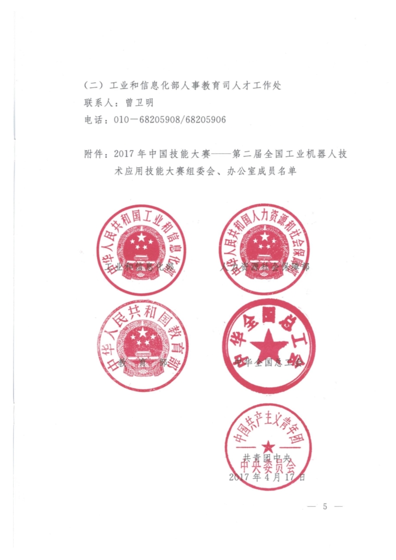 工業(yè)和信息化部 人力資源社會保障部 教育部 中華全國總工會 共青團中央關于舉辦2017年中國技能大賽——第二屆全國工業(yè)機器人技術應用技能大賽的通知