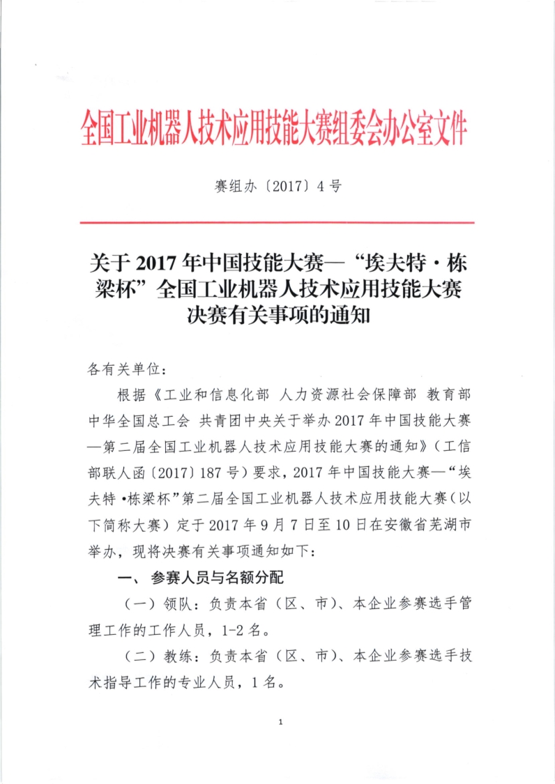 關(guān)于2017年中國(guó)技能大賽——“埃夫特?棟梁杯”全國(guó)工業(yè)機(jī)器人技術(shù)應(yīng)用技能大賽決賽有關(guān)事項(xiàng)的通知