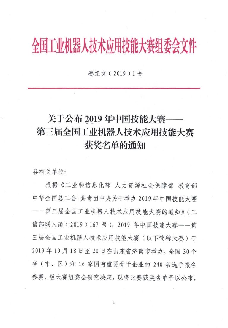 關(guān)于公布2019年中國技能大賽——第三屆全國工業(yè)機器人技術(shù)應(yīng)用技能大賽獲獎名單的通知